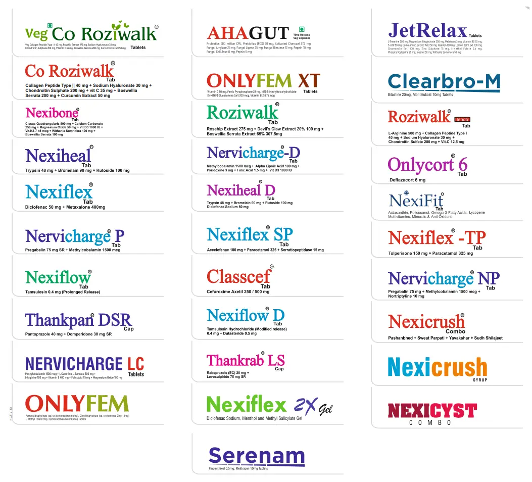| 13 | NEXIFLEX | Diclofenac (50mg) + Metaxalone (400mg) | TABLET |